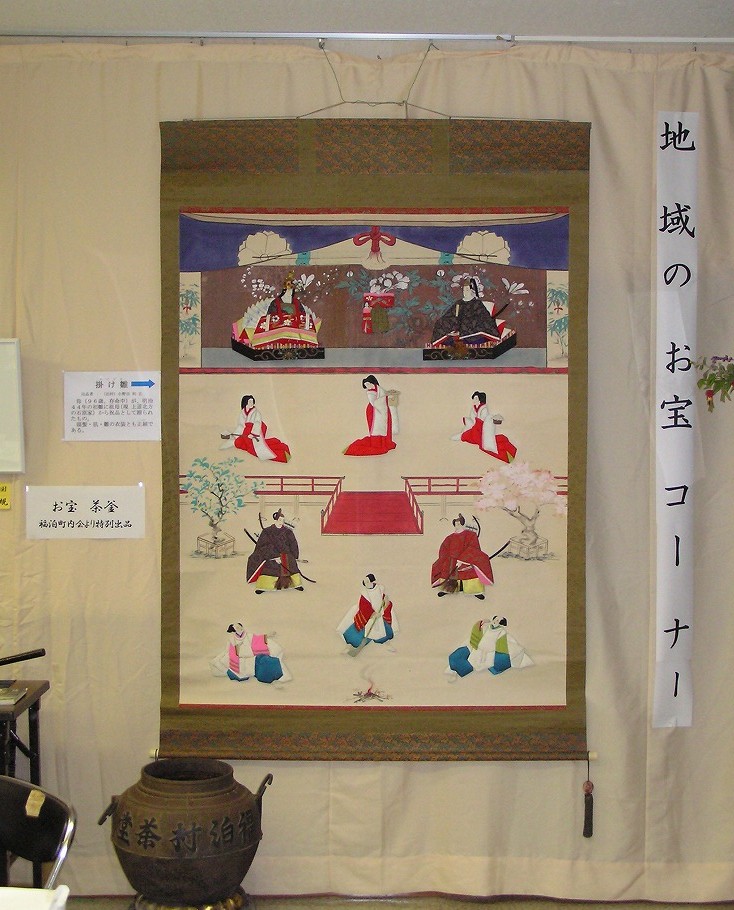 壇飾り3組、掛け雛1幅(これは、昨年の富山文化まつりに「地域のお宝」として出展されたものです(写真右側))、ガラスケース入り7箱〜延べ17点、卵雛1組、色紙雛5枚・・・といった塩梅で、座敷はお雛様に占領されています。
